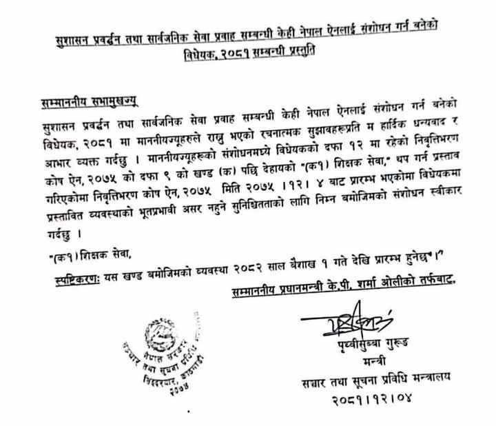 विधेयकको दफा १२ मा रहेको निवृत्तीभरण कोष ऐन, २०७५ को दफा ९ को खण्ड ‘क’ पछि शिक्षक सेवा’ थप गर्न प्रस्ताव गरिएको थियो । प्रधानमन्त्रीको तर्फबाट सञ्चारमन्त्री पृथ्वी सुब्बा गुरुङले सोमबारको प्रतिनिधि सभाको बैठकमा विधेयकमा प्रस्तावित व्यवस्थाको भूत प्रभावी असर नहुने सुनिश्चितता गरेका हुन् ।